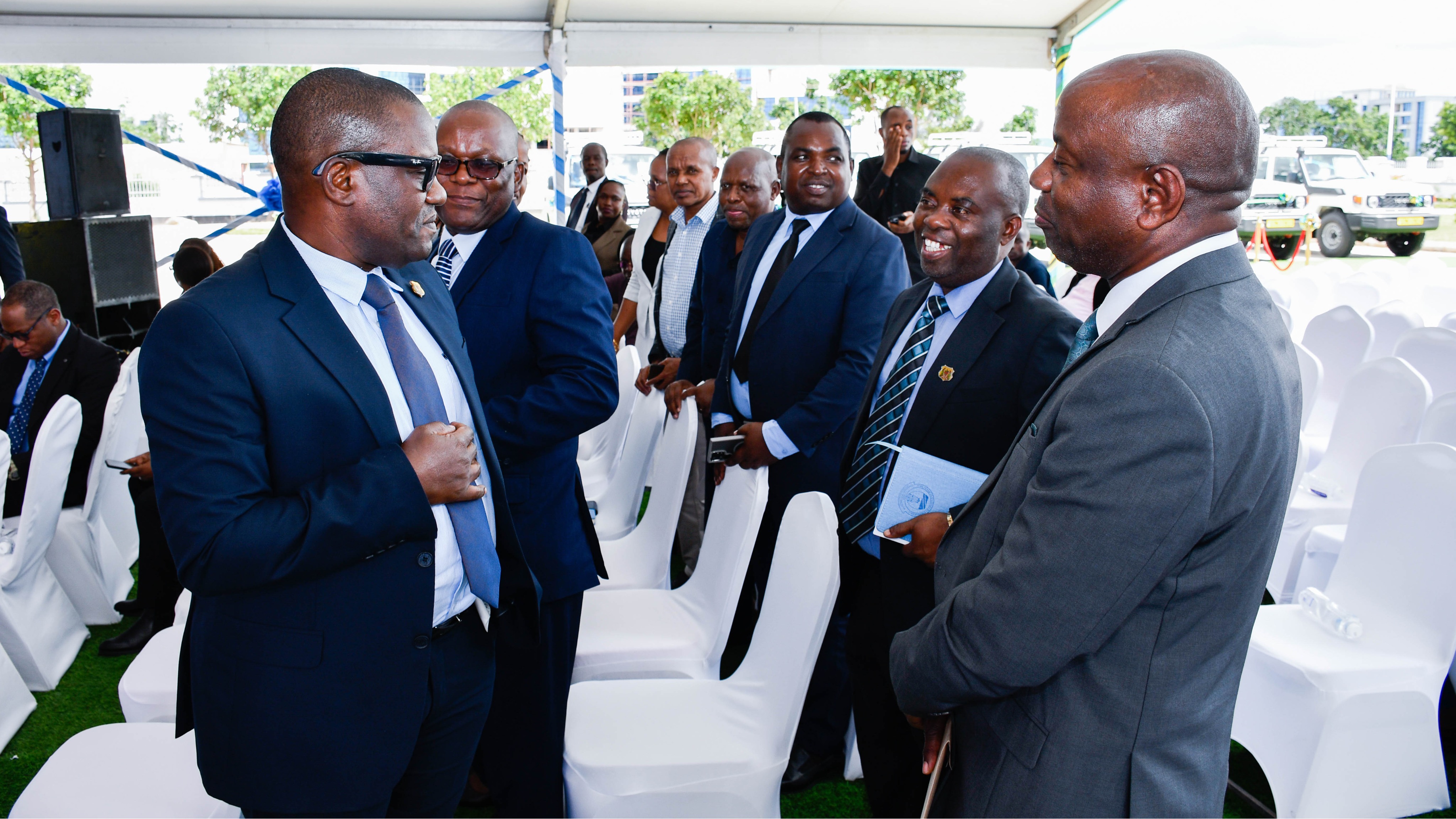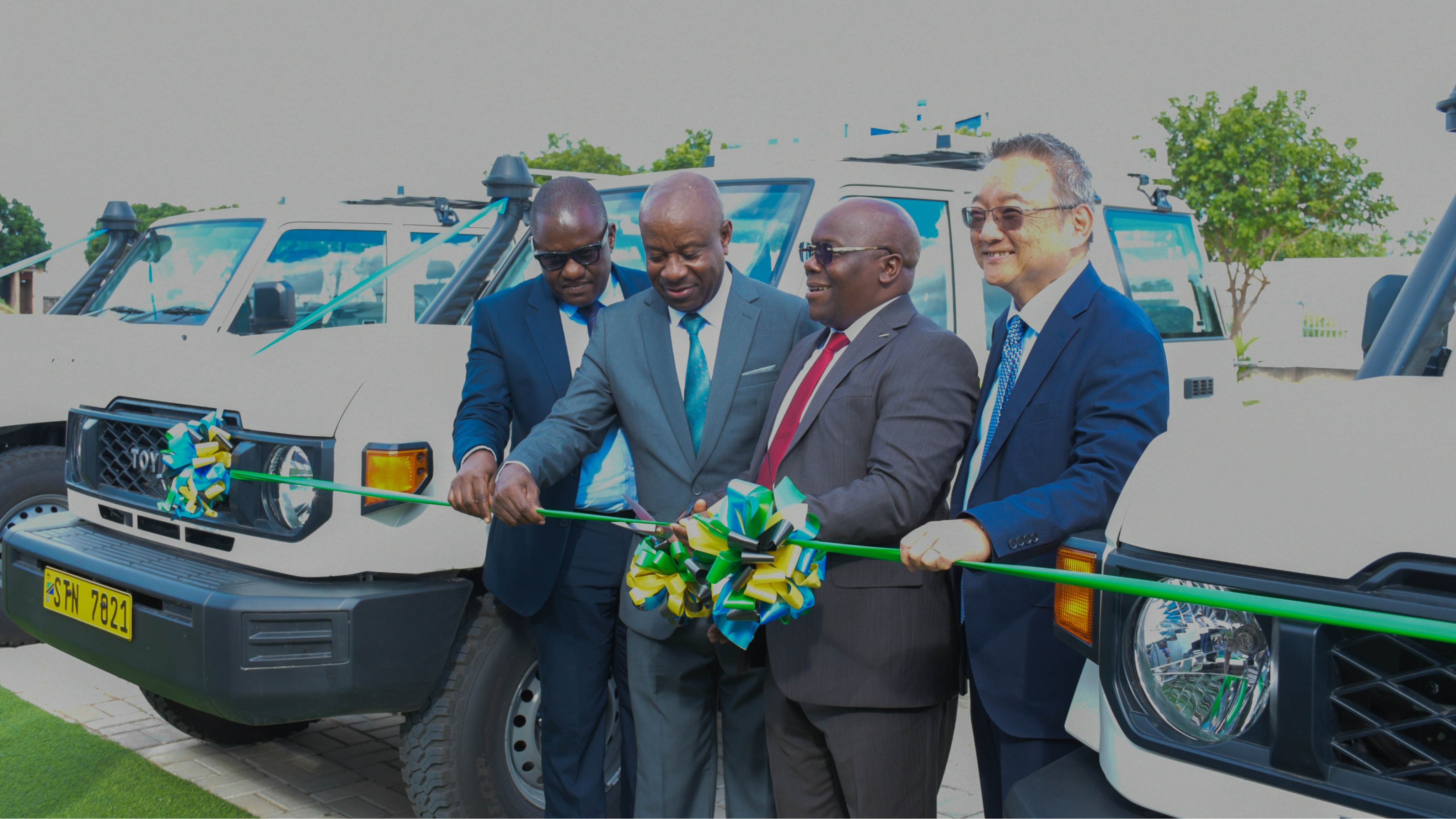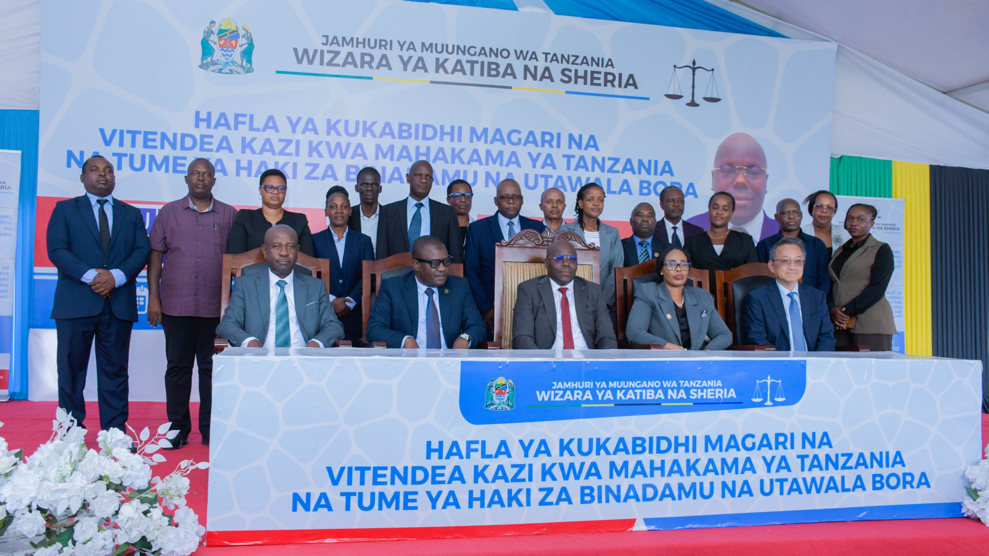 Waziri wa Katiba na Sheria Mhe. Dkt. Juma Homera (Mb) (Watatu kushoto) akimkabidhi vitendea kazi (Magari) Katibu Mtendaji wa Tume ya Haki za Binadamu na Utawala Bora, Bw. Patience Ntwina katika haf...