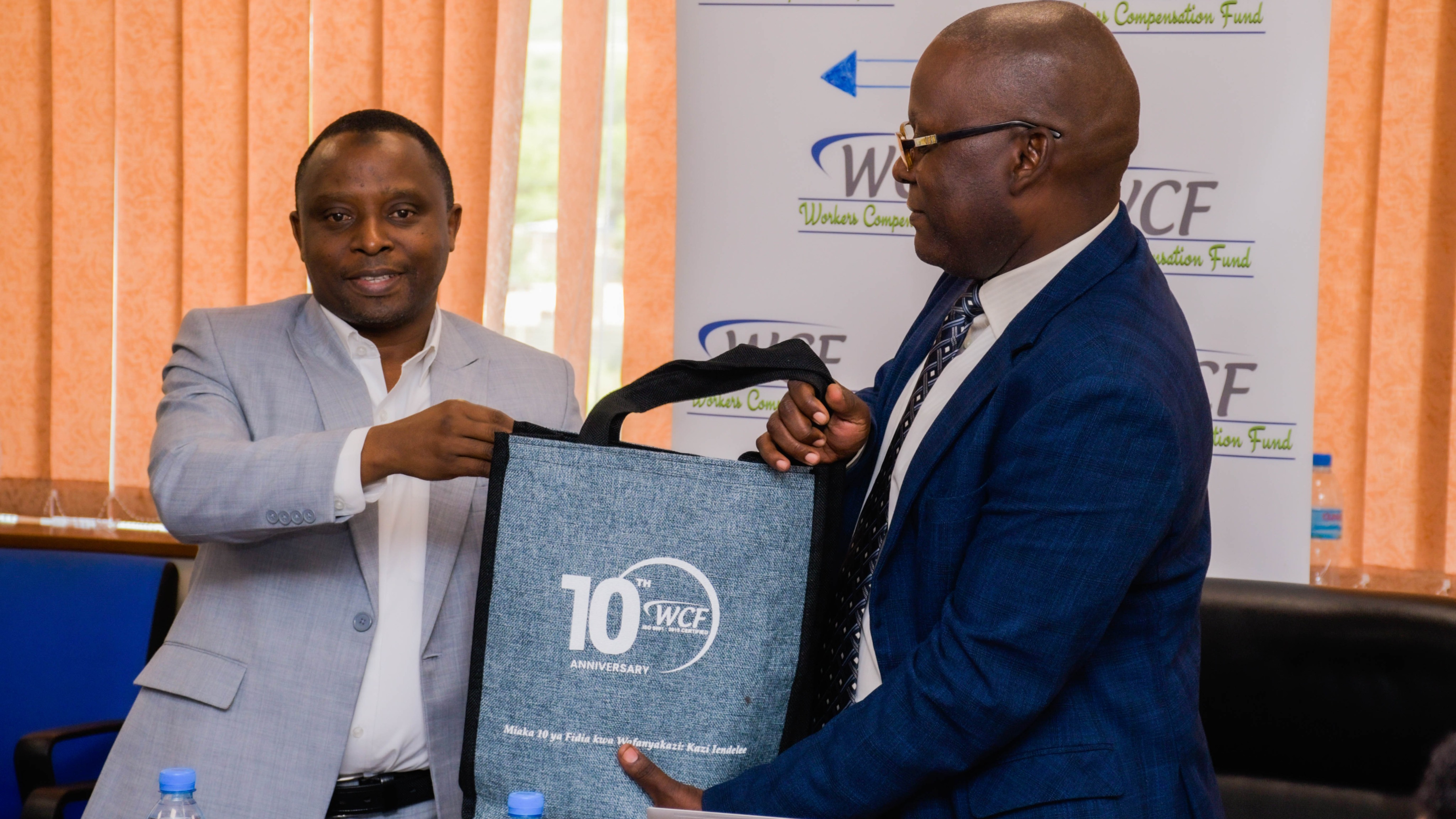 Mkurugenzi Idara ya Utawala na Rasilimali Watu THBUB, Bw. Jackson Nyamwihula (Kulia) akipokea zawadia kwaniaba ya Katibu Mtendaji kutoka kwa Kaimu Mkurugenzi Idara ya Uendeshaji Mfuko wa Fidia kwa Waf...