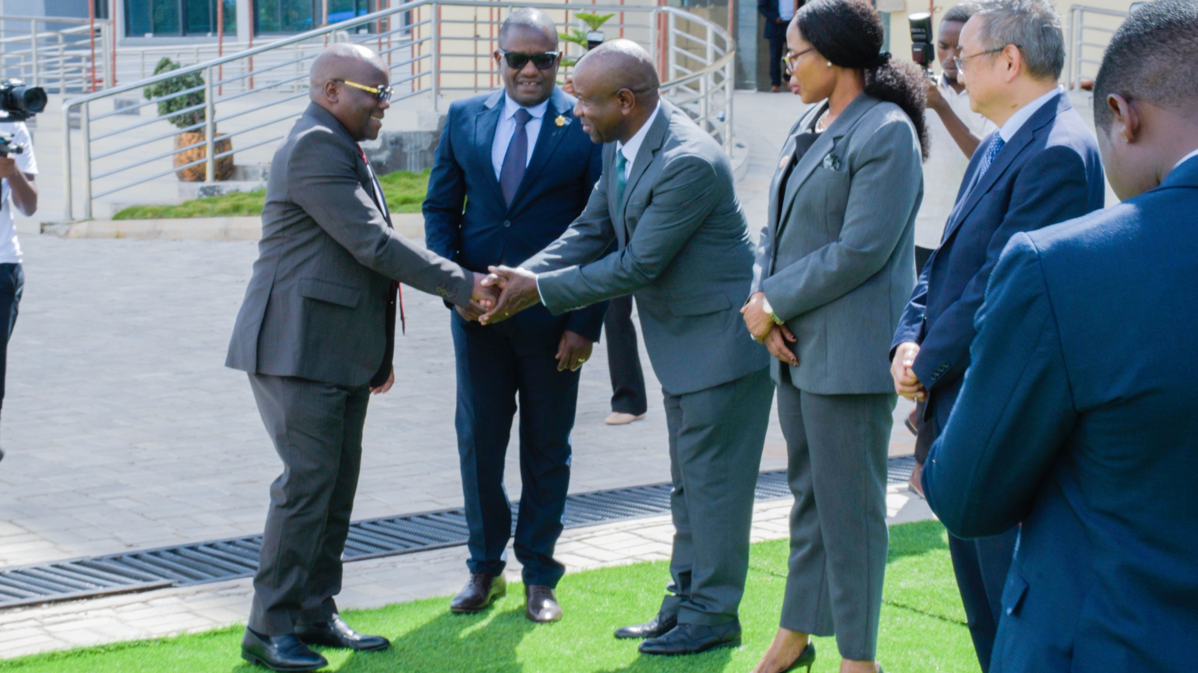 Waziri wa Katiba na Sheria Mhe. Dkt. Juma Homera (Mb) (Kushoto) akisalimiana na Katibu Mtendaji wa Tume ya Haki za Binadamu na Utawala Bora, Bw. Patience Ntwina mara baada ya kuwasili katika hafla ya...