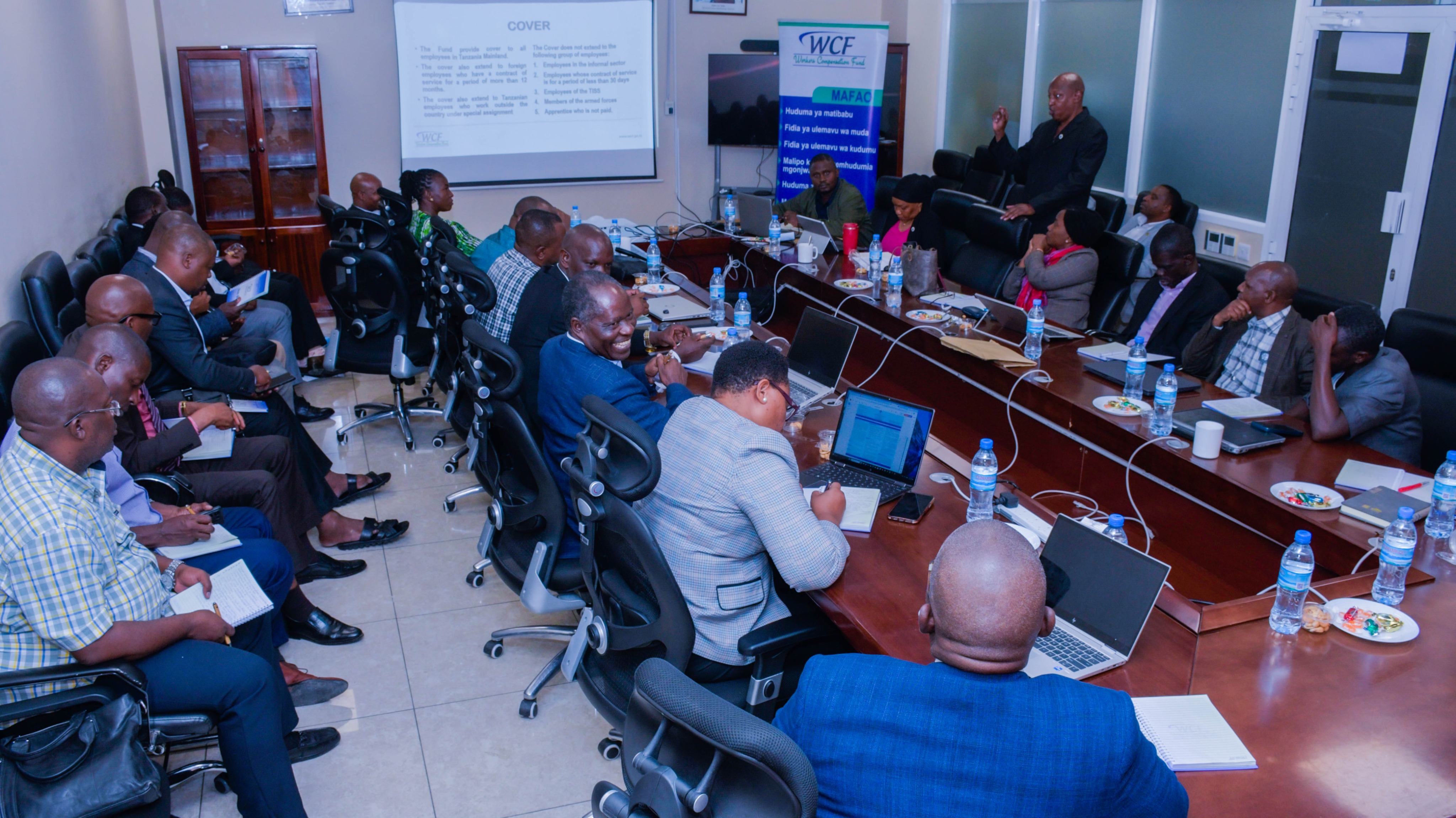 Mkurugenzi Idara ya Utawala na Rasilimali Watu THBUB, Bw. Jackson Nyamwihula akifafanua jambo wakati wa mafunzo ya fidia kwa wafanyakazi yaliyoandaliwa na Mfuko wa Fidia kwa Wafanyakazi (WCF) kwa watu...